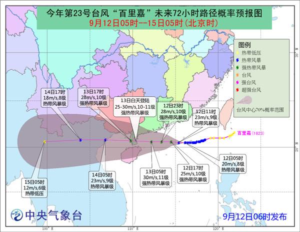 中央气象台9月12日06时继续发布台风蓝色预警:今年第23号台风“百里嘉”(热带风暴级)的中心今天(12日,下同)早晨5点钟位于广东省雷州市偏东方大约630公里的海面上。